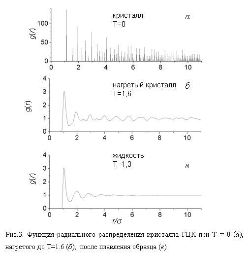 Функции радиального распределения (ФРР), рассчитанные для данной модели, показывают происходящие структурные изменения, рис.3. По мере нагрева острые пики ФРР кристаллической структуры (рис.3,а) размываются, однако дальний порядок хорошо заметен и при T = 1,6, пока образец остается кристаллическим, рис.3,б. При переходе к жидкости дальний порядок исчезает, колебания радиальной функции быстро затухают с расстоянием, рис.3,в.