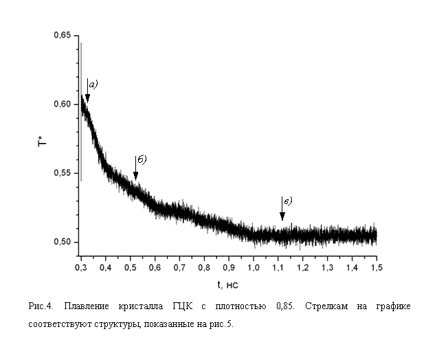 Заметим, что температура получившейся жидкости (Т =1,32) оказалась ниже, чем температура кристалла на предыдущей стадии нагрева (Т =1,4 ε/kВ). Однако продолжительная релаксация кристалла при Т =1,4 не привела к его плавлению, см. рис.2 кривая 4’. Это показывает, что при небольшом перегреве кристалл остаётся достаточно устойчивым.