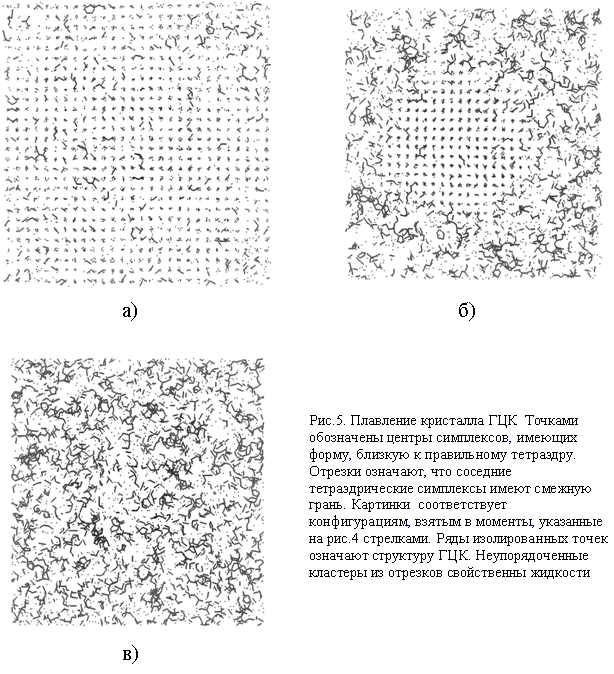Более подробно внутреннюю структуру образца можно представить с помощью метода Вороного-Делоне. Для визуализации структуры мы рисуем центры симплексов, имеющих форму хороших тетраэдров [1,2]. Если хорошие тетраэдры смежны по граням, то их центры соединяем линией. При таком подходе идеальному кристаллу ГЦК соответствуют ряды изолированных точек [8,9], (в структуре ГЦК тетраэдры контактируют только ребрами). По мере нагрева модели ровные ряды симплексов расстраиваются и появляются нетипичные для структуры ГЦК кластеры тетраэдрических симплексов, в частности, появляются тетраэдры, смежные по граням (рис. 5 а).