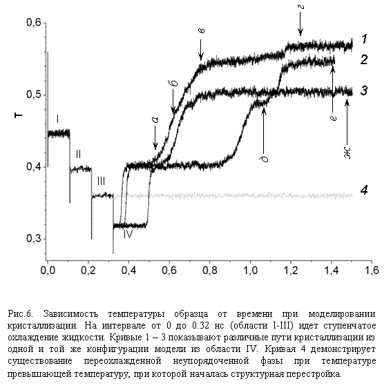 Для изучения кристаллизации мы охлаждали полученную выше модель жидкой фазы с плотностью 0,85. Охлаждение проводилось ступенчато, подобно тому, как мы нагревали кристалл на рис.2. Кинетическая энергия мгновенно уменьшалась (на величину, соответствующую понижению температуры на 0,1), и после этого происходила релаксация системы, см. рис. 6, области I-IV. Такое охлаждение продолжали до тех пор, пока в образце не началась структурная перестройка, начало которой четко видно по резкому росту кинетической энергии в области IV при достижении температуры 0,32.