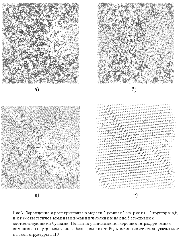 На рис.7 а–г показана структура конфигураций модели 1 в разные моменты времени (показанные стрелками на рис.6, кривая 1). Точки внутри модельного бокса, как и на рис.5, изображают центры симплексов Делоне хорошей тетраэдрической формы, а линии соединяют центры таких симплексов, если они имеют общую грань. На рис.7 а мы видим зарождение кристалла. Как только кристаллический зародыш возник, он начинает быстро расти (что видно по быстрому росту кинетической энергии), и буквально через 0,1 нс кристаллическая фаза занимает уже половину образца, рис.7 б, а еще через 0,15 нс кристаллическая фаза заполняет весь образец, однако в ней остается много дефектов рис.7, в. Дальнейшее изменение кинетической энергии замедляется, принципиальных структурных перестроек больше не происходит, идет постепенное «залечивание» дефектов. Тем не менее, этот процесс идет неравномерно. Так, в момент, указанный стрелкой г на кривой 1 (рис.6), видно небольшое но достаточно резкое изменение кинетической энергии образца, в результате чего исчезла существенная часть дефектов, и качество кристаллической структуры заметно возросло, рис.7 г.