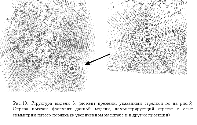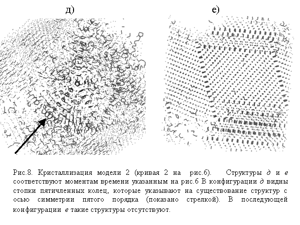 Однако в процессе кристаллизации возможны нетривиальные структурные превращения. Интересный пример дает модель 2 (см. рис.6, кривая 2). Здесь при кристаллизации, в момент времени, помеченный на рис. 6 стрелкой д, возникли структуры с 5-кратной симметрией. На рис.8 д они видны как стопки пятичленных колец. Такие стопки ранее наблюдались в моделях упаковок твердых сфер, в которых имеются кристаллические ядра [2].