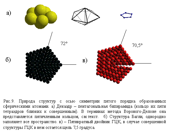 Однако с увеличением размера пентагональной призмы кристаллическая структура в ее секторах переходит в более устойчивую – ГЦК. Поэтому в кристаллографии такая структура обычно рассматривается как 5-кратный двойник структуры ГЦК. Тем более, что структура ГЦК характерна тем, что в ней выделяются макро-области правильной тетраэдрической формы, которые можно уложить в кольцо. Но здесь имеется другая проблема – двугранный угол идеального тетраэдра равен примерно 70,5 градусам, т. е.чуть меньше пятой части полного угла, а поэтому в пятикратном двойнике кристалла ГЦК остается щель в 7,5 градуса, см. рис.9, в. Однако в эксперименте (физическом или компьютерном), где атомы возмущены тепловыми движениями, такая щель легко замывается, и вопрос о природе пентагональной призмы (является она структурой Багли или пятикратным двойником ГЦК) становится непринципиальным.