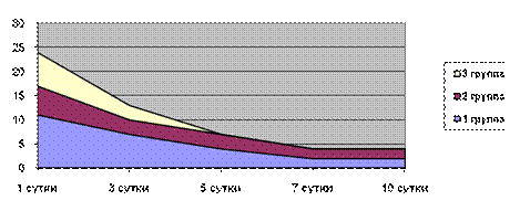 Инфузионную терапию больные получали в зависимости от клинической ситуации в сроки от 3 до 10 суток послеоперационного периода.