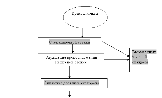 5. Схема последовательности развития патофизиологических механизмов, формирующих неблагоприятное течение послеоперационного периода у больных, получавших инфузию только кристаллоидных растворов : ухудшение оксигенации кишечной стенки, накопление ионов натрия в стенке кишечника, ведущее к его отеку. Полученные патофизиологические механизмы формируют клиническое течение : ухудшение функционирования ЖКТ, возникновение болевого синдрома, нагноение раны, несостоятельность анастомоза.
