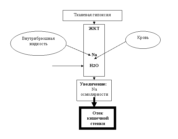 Тканевая гипоксия, возникающая в ответ на недостаток доставки кислорода, ведет к перераспределению транспорта ионов между клеткой и внеклеточным пространством : ионы натрия начинают накапливаться внутри ворсинок кишечника. Вслед за ионами натрия в ворсинках кишечника накапливается вода (, К. Чапек, 1976). Происходит отек кишечной стенки, что формирует клиническую картину отсутствия перистальтических движений, то есть парез кишечника. Такая картина наблюдалась у больных 1-й группы, которым инфузировали только кристаллоидные растворы, и в меньшей степени у больных 2-й группы, которым инфузировали ГЭК 130/0,4 с кристаллоидами.