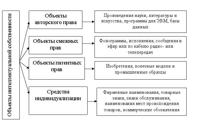 Статья 1225 ГК РФ закрепляет исчерпывающий перечень объектов интеллектуальной собственности (произведения науки, литературы и искусства, программы для ЭВМ, базы данных, исполнения, фонограммы, сообщение в эфир или по кабелю радио - или телепередач, изобретения, полезные модели, промышленные образцы, селекционные достижения, топологии интегральных микросхем, секреты производства, фирменные наименования, товарные знаки и знаки обслуживания, наименования мест происхождения товаров, коммерческие обозначения), которые можно разделить на виды: