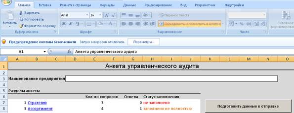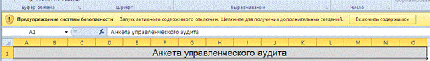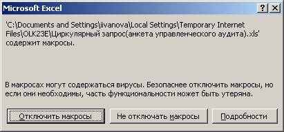 2. При открытии этого файла MSExcel в целях поддержки безопасности выдаст Вам вопрос об отключении макросов. В файле анкеты управленческого аудита макросы необходимы, так как выполняют важные функции заполнения анкеты, перехода по страницам, проверки значений и подготовки отчета. Макросы в ней отключать нельзя. Поэтому