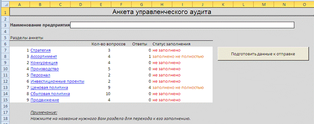 Если Вы при открытии файла «Циркулярный запрос(анкета управленческого аудита).xls» оказались на одном из других листов анкеты, то пролистните его до верней строки, где Вы увидите надпись синего цвета