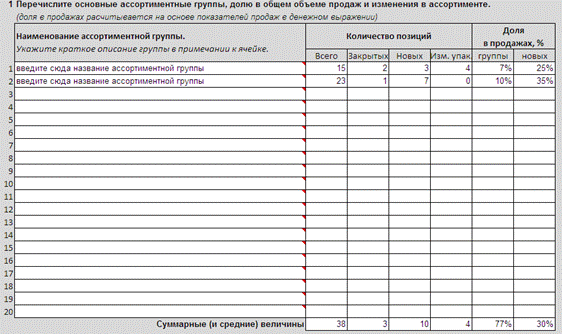 1. Вопрос 1. В этом вопросе приведена для заполнения таблица. В ней приведен список из 20-ти ассортиментных групп продукции. Возможно, Ваше предприятие выпускает меньшее число групп, тогда заполните верхние строки, а остальные оставьте пустыми.