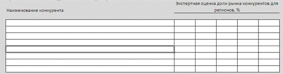 Проводите оценку доли рынка конкурента по всем продуктовым группам, по которым Ваше предприятие пересекается с конкурентом в этом регионе. Список конкурентов ограничен восемью строками, так что следует выбирать только основных. Некоторые конкуренты могут действовать в нескольких регионах, некоторые только в одном. Если какой-либо конкурент в определенном регионе не представлен, то не ставьте 0%, просто оставьте эту ячейку пустой.