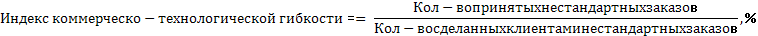 В основе расчета – нестандартные заказы, сделанные клиентами. К ним относятся запрашиваемые клиентом продукты или услуги, которые обычно не предоставляются компанией или не указаны в прайс-листе. Например, определенные размеры, упаковка, комплектация или модификация продукции, специальное исполнение, какие-либо дополнительные услуги. Если компания решает принять и выполнить такой нестандартный заказ, то это говорит о её гибкости. Расчет индекса необходимо произвести по итогам года.