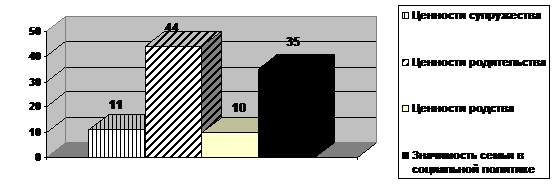 Как показало исследование, характерными чертами семьи сегодня являются рост числа нерегистрируемых браков и разводов, снижение рождаемости и доли детей, родившихся в браке. Трансформация типичной модели семьи в первую очередь нашла отражение в популяризированных средствами массовой информации образах семьи, которые в значительной степени оказывают влияние на формирование семейных ценностей. Мы выделили три группы семейных ценностей: ценности, связанные с супружеством; ценности, связанные с родительством и ценности, связанные с родством.