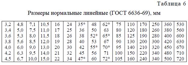 определить величину минимально допускаемого диаметра (полученное значение округлить до ближайшей большей величины из ряда нормальных линейных размеров по ГОСТ 6636-69 (табл. 6).