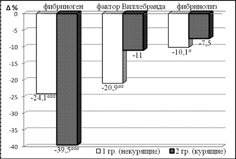 Пациенты обеих гр. исходно не различались по показателям параметров системы гемостаза: уровню в плазме крови ФГ, активности ФВ и ФА (таблица 2). На фоне 12-нед терапии симвастатином-генериком отмечено достоверное снижение уровня ФГ как у некурящих пациентов (1 гр.), так и у курильщиков (2 гр.) на 24,1±24,2% (р=0,001) и 39,5±34,5% (р=0,0003), соответственно. Хотя у курящих изменения были более выраженными, различия между гр. не достигли статистической достоверности (рисунок 2).
