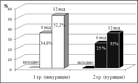 Прием препарата в дозе 40 мг/сут у больных ИБС с ГЛП позволил достичь целевого уровня ОХС через 6 и 12 нед у 34,8% и 52,2% некурящих и 25,0% и 35,0% у курящих пациентов, соответственно, однако различия между гр., очевидно, в силу их малочисленности, не достигли статистической значимости (рисунок 4).