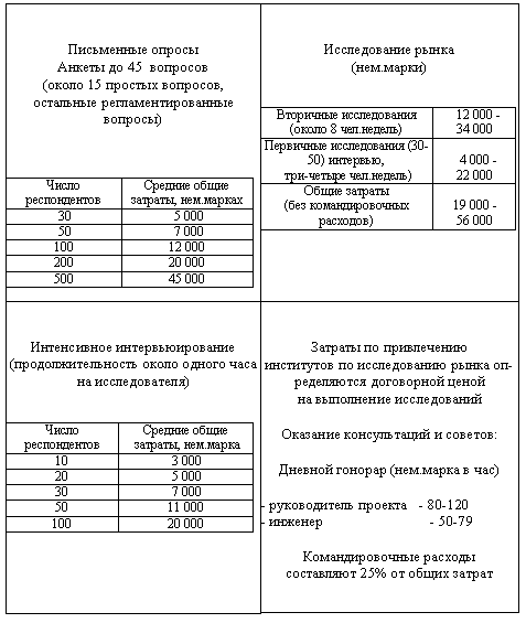 Наряду с рассмотренным подходом для оценки затрат на маркетинговые исследования могут быть использованы данные с помощью письменных опросов, интервью, исследование конкретных рынков (табл.3.1.). В этих случаях устанавливаются зависимости средних общих затрат на маркетинговые исследования от числа опрашиваемых или числа интервью. При исследованиях рынка устанавливаются зависимости, соответственно для первичных и для вторичных исследований, затрат на исследование в зависимости от трудоемкости получения информации (чел. неделях).