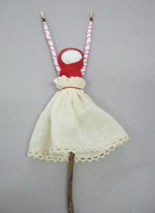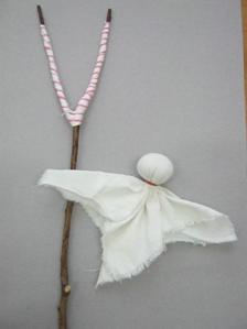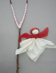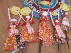 необходимо заострить, обмотать полосками пестрой ткани. Это будут руки.