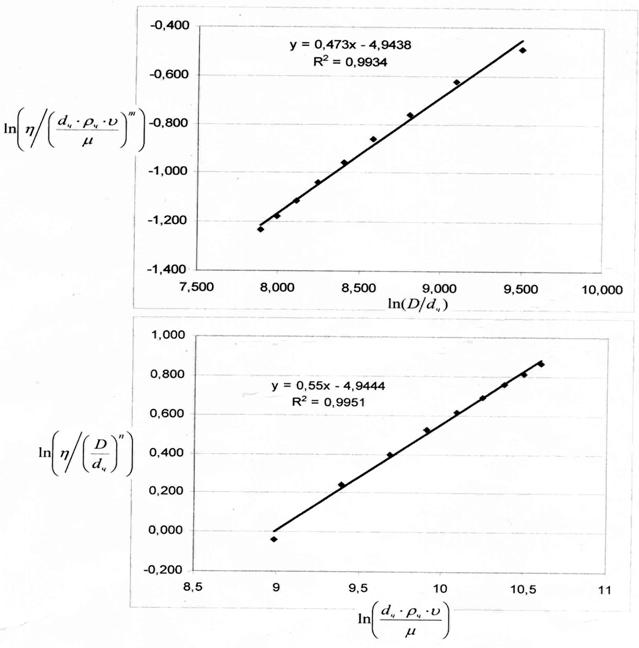 . Коэффициенты m и n подбирают до тех пор, пока на обоих графиках достигнут расположения точек вдоль прямых при наименьшем разбросе их. Коэффициент А определяют из уравнения (4) при известных величинах, как уравнение с одним неизвестным.