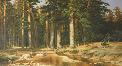 Ра…лапистые ветви хв…я, яркая и теплая на свету и мрач(?)ная в тени, пр…зрачная вода серый камень з…леная трава серо-зеленый мох п…дмытый потоком берег выбравш...еся из-под земли наружу кривые корни все зам...чает взгляд ж…вописца. Но при этом художник помнит о главном, ради к…торого задумал и писал картину. А главное на картине – русский лес. Стройные сил(?)ные, чуть ли не до самого неба.