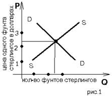 Свободно плавающие валютные курсы определяются беспрепятственной игрой спроса и предложения. Рассмотрим курс, или цену, по которой американские доллары могут быть обменены, скажем, на британские фунты стерлингов. Как показано на рисунке 1, спрос на фунты будет снижаться, а предложение фунтов – повышаться. Почему?