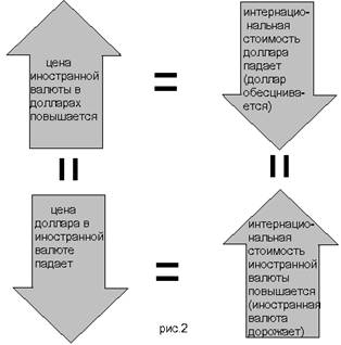 Валютный курс, устанавливаемый свободными рыночными системами, может изменяться и действительно часто изменяется. Когда цена фунта в долларах увеличивается, например, поднимается с 2 дол. за 1 ф. ст. до 3 дол. за 1 ф. ст., то говорят, что стоимость доллара понизилась, или доллар обесценился по отношению к фунту. В более общем виде обесценение валюты означает, что для покупки одной единицы какой-либо иностранной валюты (фунтов) потребуется затратить больше единиц национальной валюты (долларов). И наоборот, когда цена фунта в долларах снижается – падает с 2 дол. за 1 ф. ст. до 1 дол. за 1 ф. ст., - стоимость доллара повышается, или доллар дорожает по отношению к фунту. В общем виде удорожание валюты означает, что на покупку единицы какой-либо иностранной валюты (фунтов) потребуется затратить меньше единиц национальной валюты (долларов). Если доллар обесценивается по отношению к фунту, то фунт относительно доллара дорожает, и наоборот. Эти закономерности показаны на рис. 2