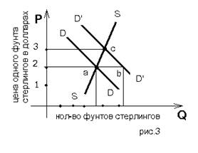 Предположим, что потребительские вкусы американцев изменились, и они решили покупать больше британских автомобилей или что в США повысился по сравнению с Великобританией, что процентные ставки в США упали относительно Великобритании. Любое из этих событий или все они вместе обусловят рост спроса американцев на британский фунт с DD, скажем, до D’D’ на рис.3. Видно, что при первоначальном валютном курсе 2 дол. = 1 ф. ст. дефицит американского платежного баланса составил ab. То есть при курсе 2 дол. = 1 ф. ст. американцы испытывали нехватку фунтов в размере ab. Американские операции экспортного типа позволят получить фунты в объеме, но для финансирования операций импортного типа американцам потребуется ф. ст. В связи с тем, что мы имеем дело с рынком, где действует свободная конкуренция, эта нехватка изменит валютный курс (цену фунта в долларах) с 2 дол. = 1 ф. ст. до, скажем, 3 дол. = 1 ф. ст., то есть курс доллара снизится.