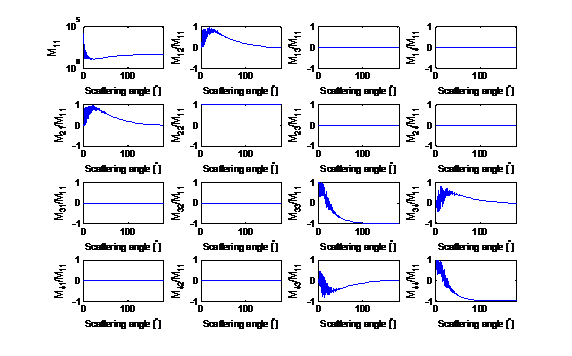 Рис. 1. Зависимости компонентов матрицы Мюллера (верхний набор графиков) и сечения рассеяния от угла рассеяния. Результаты приведены для различной поляризации падающей волны