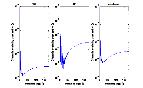 Проблеме рассеяния плоской электромагнитной волны на тонком проводящем цилиндре посвящено значительное число работ. Наибольший интерес с точки зрения применения в вышеозначенной задаче представляют результаты работ, в которых найдены аналитические решения для оценки пространственного распределения потока энергии [2-5]. В частности, интерес представляет применение метода T-матрицы [4,5], поскольку получаемые параметры рассеяния зависят исключительно от характеристик рассеивающего элемента. Так, в работе [6] получено решение волнового уравнения, допускающее нахождение компонентов матрицы T1...T4 и матрицы Мюллера. Указанный подход был использован для расчета параметров рассеяния плоской электромагнитной волны с λ=0.633 мкм на сканирующем элементе - тонкой вольфрамовой нити с диаметром d=12.1 мкм. Предполагалось, что нить покрыта слоем естественного окисла. Комплексный показатель преломления для вольфрама был взят равным 3.6382+j2.7959, а для пленки оксида вольфрама WO3 принимался равным 1.82+j0.12 [7-9]. Указанные значения использовались также при расчетах индикатрис рассеяния, при этом толщина пленки WO3 на поверхности вольфрамовой нити принималась равной 10 нм. Для расчета использовался модифицированный пакет MatScat [10]. Результаты расчетов приведены на рис.1. Наиболее показательным результатом можно считать незначительную разницу (менее 0.02-0.04 абсолютных значений) между результатами расчета с учетом и без учета слоя окисла на поверхности нити. Указанная особенность позволит в дальнейшем отказаться от применения усложненной модели дифракции на многослойном цилиндре в расчетах распределения поля за указанным дифракционным элементом.
