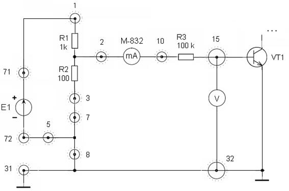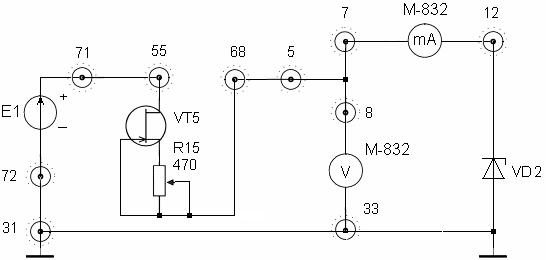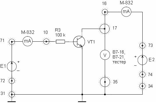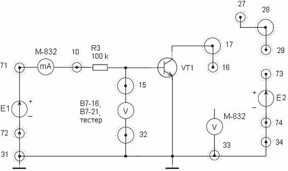 - UКЭ = +5 В, тогда используйте перемычку (17-28), (29-73), мультиметр М-832 подключите к гнездам 16 и 33.