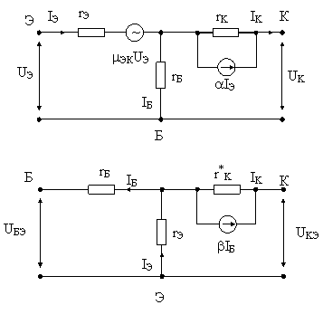 Каждому элементу, например схемы ОБ, можно придать физический смысл: rЭ – дифференциальное (динамическое) сопротивление эмиттерного перехода, включенного в прямом направлении; rБ – сопротивление базы для переменного тока примерно равно сопротивлению базы для постоянного тока; rК – динамическое сопротивление коллекторного перехода, смещенного в обратном направлении.
