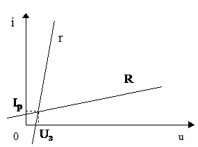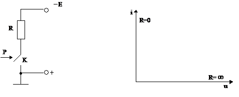 Ключ К замыкается и размыкается под действием внешней силы Р. Сопротивление идеального ключа в замкнутом состоянии равно нулю, а в разомкнутом - бесконечности, то есть его вольт-амперная характеристика (ВАХ) совпадает с осями координат (рисунок 5). В действительности даже механический ключ (рубильник, выключатель) является неидеальным. Он имеет сопротивление r во включенном и конечное сопротивление утечки R в выключенном состоянии. ВАХ такого ключа уже не совпадает с осями координат, а имеет угол наклона к осям (рисунок 6). Существенным отличием электронных ключей является смещение их ВАХ относительно начала координат на величину IР и UЗ соответственно, где IР - ток разомкнутого ключа (остаточный ток), а UЗ падение напряжения (остаточное напряжение) в замкнутом состоянии ключа (рисунок 7).