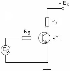 Принципиальная схема транзисторного ключа ОЭ изображена на рисунке 8. Здесь входной управляющий сигнал EБ, задающий базовый ток транзистора, играет ту же роль, что и сила P в схеме на рисунке 4, а сам транзистор VТ1 играет роль ключевого элемента К. Управляемой является коллекторная цепь с источником питания ЕК и нагрузкой в виде RК. Транзистор n-p-n - типа включен по схеме с общим эмиттером. При действии отрицательного сигнала транзистор запирается, а при действии положительного может входить в режим насыщения, если оба перехода транзистора будут находиться в прямом включении.