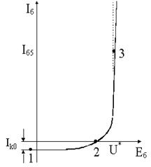 . Пересечение данной входной характеристики с нагрузочной прямой (точка 3) показывает, что при IБ5 значения UКЭ и UБЭ равны. Последнее означает, что коллекторный переход открывается при увеличении IБ по сравнению с IБ5, т. е. транзистор входит в режим насыщения. Таким образом, IБ5=IБН, а условием формирования РН является IБ ³ IБН.