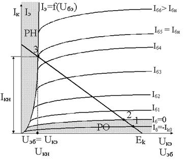 На выходной характеристике транзистора (рисунок 9) запертое состояние транзистора (режим отсечки) отмечен зоной РО, а режим насыщения зоной РН. Между ними находится зона усилительного режима.