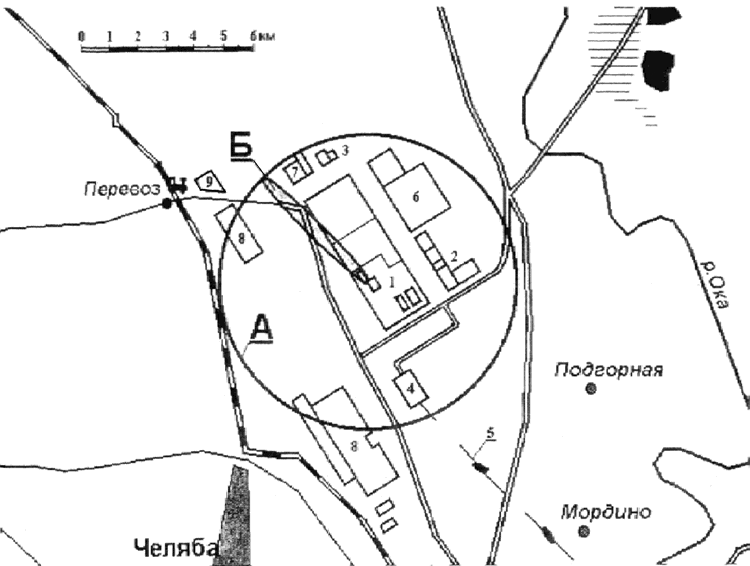 #G0Обозначения: 1 - производство хлора, 2 - заводоуправление, 3 - товарно-сырьевая база, 4 - склад полупродуктов, 5 - продуктопровод, 6 - ТЭЦ-1, 7 - шламохранилище, 8 - АО "Север", 9 - санаторий. А - зона возможного смертельного поражения для сценария С Краткое описание сценария аварии: Сценарий С Основные исходные расчетные данные: Основной поражающий фактор - токсическое. Расчет зон действия поражающих факторов произведено по методике "ТОКСИ". Скорость ветра 1 м/c; состояние атмосферы - инверсия; температура окружающей среды - 20 Наименование и количество вещества, участвующего в аварии: Хлор; при полном разрушении цистерны возможен выброс 54 т хлора. Величины зон действия основных поражающих факторов: Длина зоны возможных смер тельных поражений - 5,61 км, ширина - 0,29 км. Длина зоны возможных пороговых поражений - 20,2 км, ширина - 0,98 км. Возможное число пострадавших: в зоне возможных смертельных поражений (Б) - до 10 чел., в зоне возможных смертельных поражений (А) - до 450 чел. |