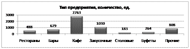 Среди всех предприятий общественного питания наиболее многочисленными заведениями являются кафе. Классические рестораны составляют от общего количества только около 8 проц. Это свидетельствует о популярности среди населения более демократичных по формату обслуживания заведений.