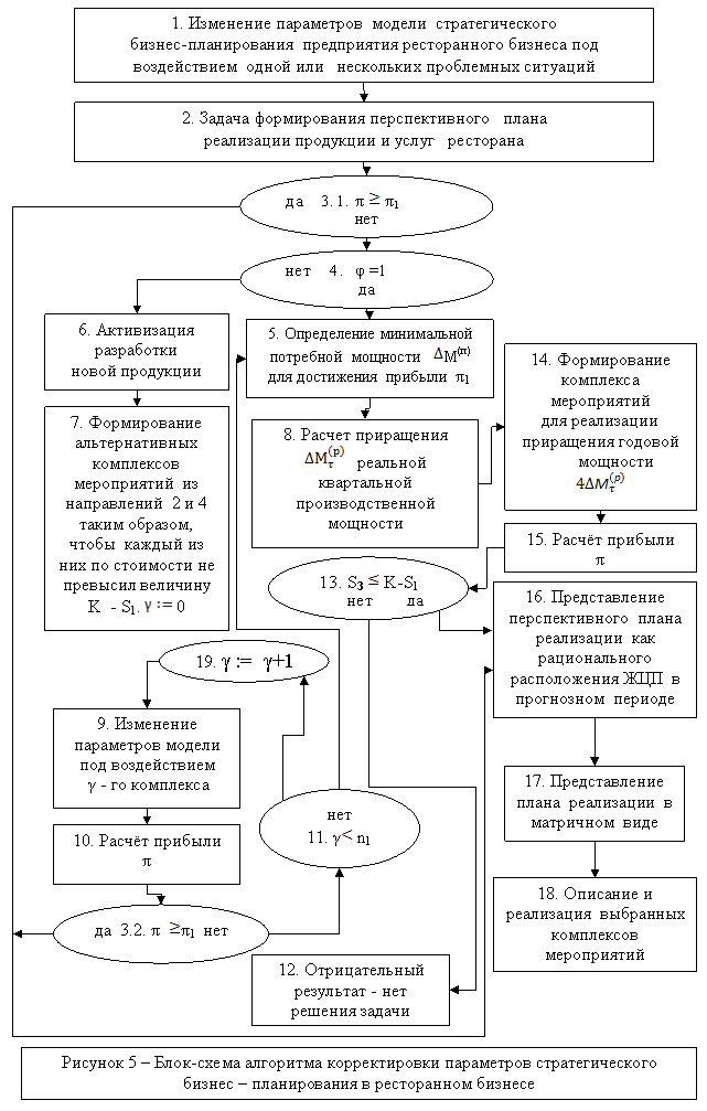 Сущность процесса стратегического планирования сводится к поиску вариантов поведения предприятия ресторанного бизнеса на рынке, где существует жесткая конкурентная борьба. Как правило, долгосрочный бизнес-план корректируется каждый год, но возможны его корректировки и внутри года, если необходима быстрая реакция предприятия на возникающие проблемные ситуации в условиях нестабильной экономики. Корректировки бизнес-плана, в конечном счете, реализуются в изменениях комплекса выбираемых стратегических мероприятий и в соответствующих изменениях максимальной прогнозной прибыли. Разработан алгоритм планирования и блок-схема, отражающие специфику возникающих в настоящем и будущем времени проблемных ситуаций в последовательности действий планирования (рис.5).