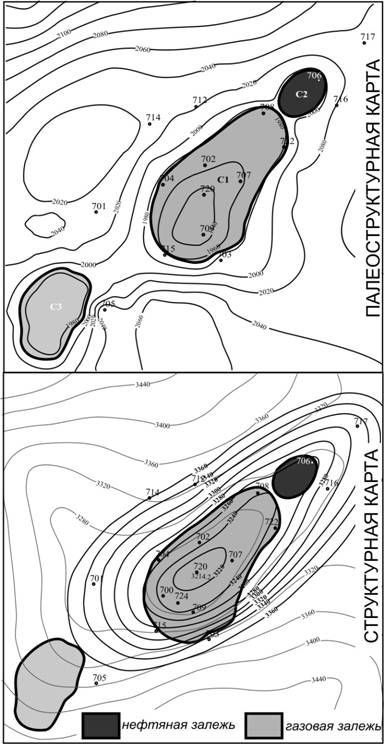 Таким образом, положение контура залежи может быть установлено путем палеоструктурного анализа в сочетании с данными опробования скважин. При прогнозировании положения контуров нефтегазоносности, геологи, в основном, опираются на современную структуру продуктивных пластов, что нередко приводит к существенным ошибкам, в частности, при определении площади залежи. По свидетельству (1991), в Западной Сибири 47% ошибок при подсчете перспективных ресурсов УВ возникает вследствие неверного определения площади залежи.
