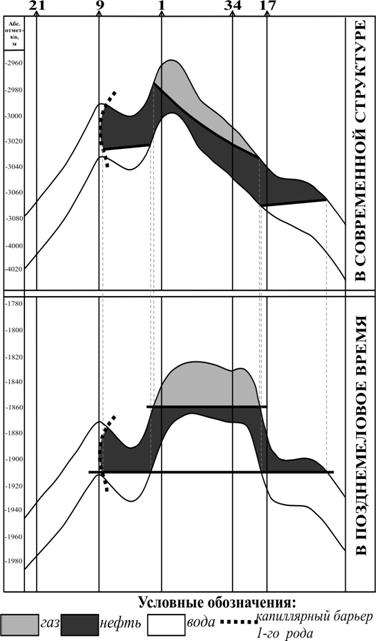По свидетельству (1983), суммарные амплитуды неотектонических движений в районе Песцового вала составили 75-175 м. Кроме того, отмечается значительная дифференциация неотектонических движений, что приводило к раскрытию одних антиклинальных ловушек, искажению первоначальной формы других и возникновению третьих. Степень охлаждения нижнемеловых отложений в этом районе составила около 400С ( и др., 1987), что вызвало существенное увеличение капиллярных давлений на контактах воды и нефти, а также нефти и газа. В результате пространственное положение контуров нефтяного и газового скоплений определялось уже не подчинением их форме ловушки, согласно антиклинально-гравитационной концепции, а характером и направленностью её тектонического развития. Капиллярные давления в песчаных породах пласта БУ9 при современных пластовых условиях составляют от 3 до 23,16 кПа. При этом максимальными значениями капиллярных давлений характеризуются западные участки месторождения. Из этого следует, что в геологическом прошлом, до момента снижения пластовых температур, нефтяное и газовое скопления пласта БУ9 должны были в своей восточной части располагаться в пределах Песцового поднятия в полном соответствии с антиклинально-гравитационной концепцией нефтегазонакопления и иметь положения ВНК и ГНК в восточной части месторождения близкие к горизонтальным. С запада нефтяная и газовая залежи в период нефтегазонакопления контролировались изначально барьерной водоносной песчаной фацией, что обусловлено развитием на западе месторождения относительно мелкопоровых песчаных фаций, определивших здесь присутствие капиллярного барьера первого рода (рис. 2).