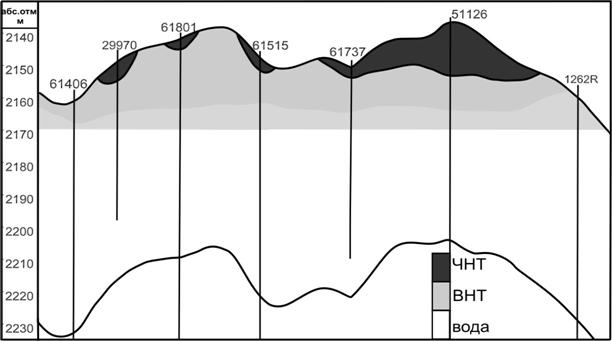 Следует отметить, что за весь период разработки, с 1993 по 2006 год, обводненность скважин в ПВНТ изменяется хаотически от 8 до 63% и имеет максимальные значения на первой стадии разработки. Обводненность же скважин в ЧНТ со временем закономерно увеличивается от 0 до 77%, что обусловлено подтоком подошвенных вод в процессе разработки.