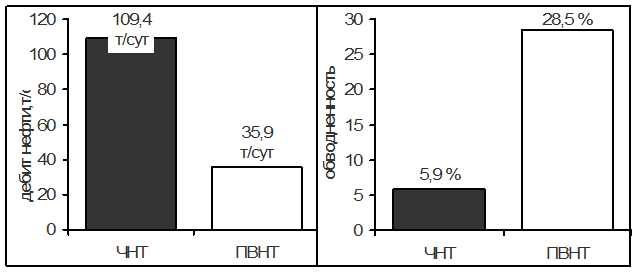 Рис. 4. Графики сравнения начального среднего дебита нефти и обводненности скважин, находящихся в ЧНТ и ПВНТ