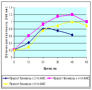 Штамм характеризовался активным ростом на АМС при его концентрации 6 г/л, хотя при 6 г/л наблюдается торможение роста, удлиняется лаг-фаза, но активной остается экспоненциальная фаза роста. Лабораторные исследования показали, что оптимальной ростовой концентрацией АМС для изучаемого штамма была 2-4 г/л, при которых изучалась динамика роста и накопления промежуточных продуктов окисления субстрата.