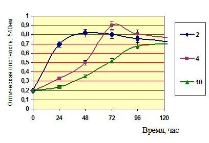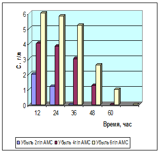 Из рисунка 1 следует, что при концентрации АМС 2 г/л культура достигает стационарной фазы роста к 24 часам, при концентрации АМС 4 г/л - к 48 часам, при этом токсикант в культивируемой среде не обнаруживался.