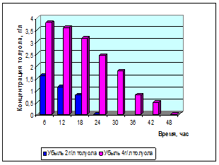 Исследования по дальнейшей очистке модельных стоков, содержащих в качестве основных загрязнителей толуол и стирол, проводили на лабораторной модели этой же установки по очистке промышленных сточных вод с исполь-зованием двух активных штаммов - P. aeruginosa ДС-26 и P. putida D-12. Перед подачей стока клетки микроорганизмов деструкторов толуола и стирола адсорбировали на стеклоткань и помещали в аэрофильтр. Для получения стабильных результатов опыт продолжался в течение 2-х месяцев для каждого токсиканта.