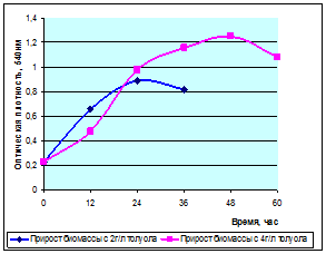 Для проверки способности штамма использовать толуол в качестве рос-тового субстрата инкубацию проводили с добавлением токсиканта в концент-рации 2 и 4 г/л. В ходе постановки экспериментов было отмечено, что штамм использовал толуол при всех исследуемых концентрациях, причем кривая роста характеризовалась фактическим отсутствием лаг-фазы (рисунок 2).
