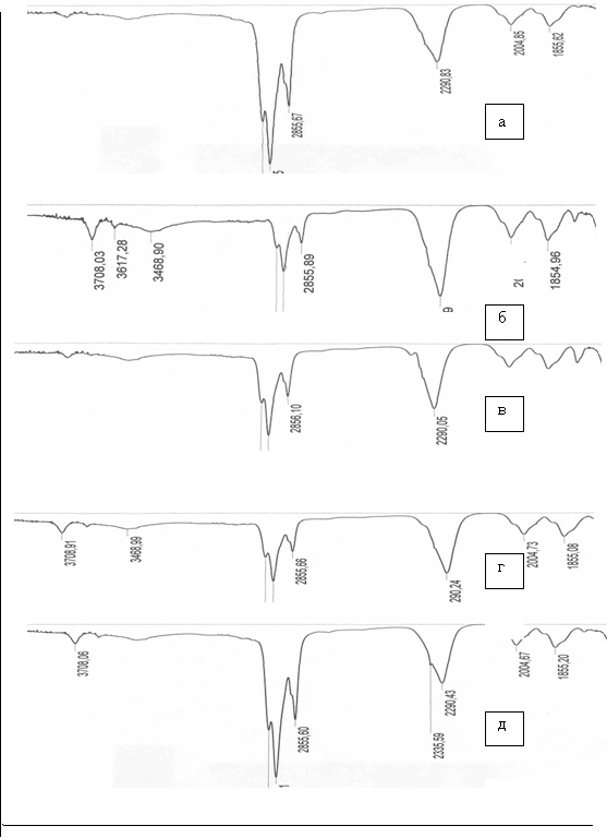 Ось абсцисс – υ см-¹, ось ординат – пропускание, а – контроль (без культуры), б – P. mendocina Н3, в – P. aeruginosa 8, г – P. stutzeri Н10, д – P. mallei 36К