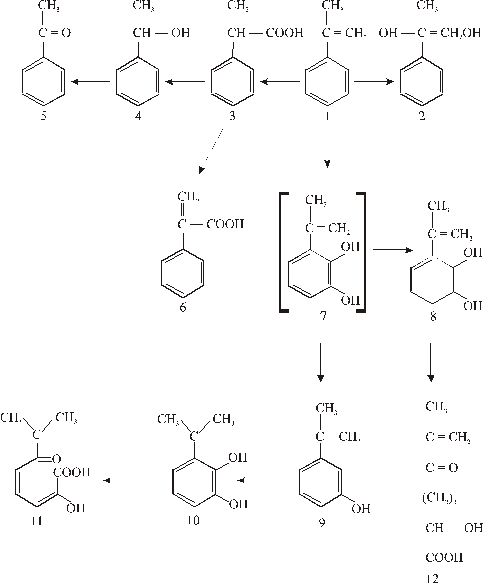1 – АМС; 2 – 1,1– фенилметилгликоль; 3 – α - фенилпропионовая кислота; 4 - метилбензиловый спирт; 5 - ацетофенон; 6 - α - фенилакриловая кислота; 7 – гипотетический продукт; 8 - (цис)-2,3-дигидро-окси-1-изопропенил-6-цикло-гексен; 9 – (окси)- изопропенилбензол; 10 – 3-изопропилкатехол; 11-12 – алифатические кетокислоты
