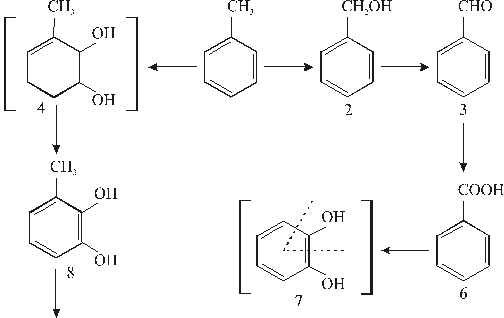 1- толуол; 2 – бензиловый спирт; 3 – бензальдегид; 4 – бензойная кислота; 5 – гитотетический пирокатехин; 6 – 3 метилкатехол;