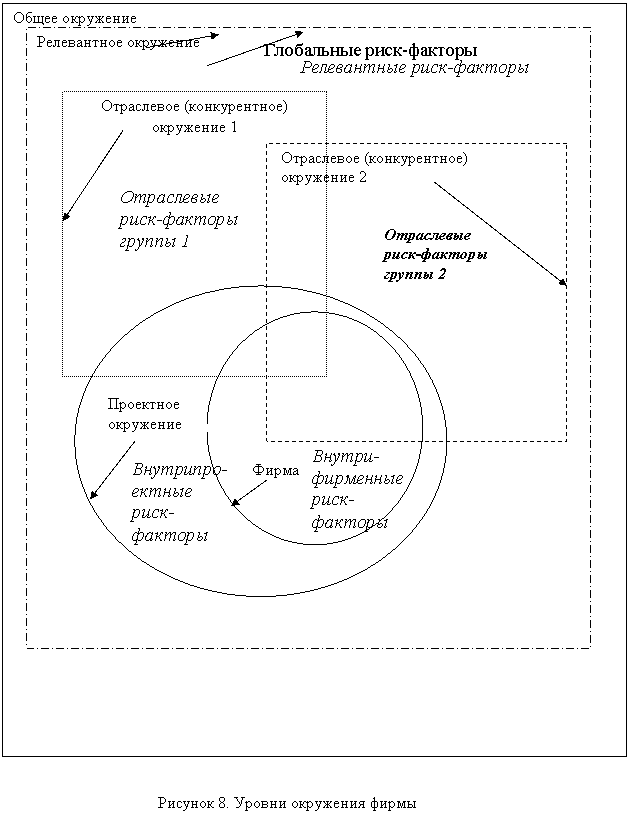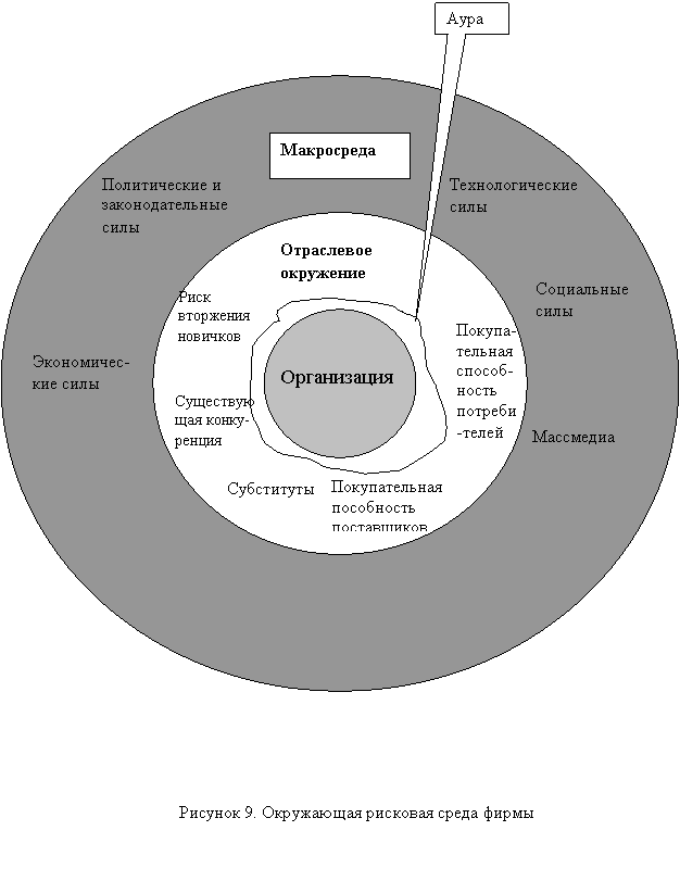 Коммерческие банки и их корпоративные клиенты, как и все организации, имеют дело с переменами по причинам, коренящимся не только внутри нее самой, но и по исходящим от объектов и факторов вне ее (рисунок 8). Внешняя среда постоянно изменяется, производя для организации и возможности, и угрозы. Для анализа рисков внешней среды ее удобно разделить на макросреду и отраслевую среду. Макросреда состоит из политических, законодательных, экономических, технологических, информационных и социальных систем, которые способны повлиять на судьбу организации. Более узкий круг влияния - совокупность фирм, производящих конкурирующую продукцию и услуги - отраслевая среда (рисунок 9). Важнейшей частью отраслевой среды для любой фирмы является ее собственная аура. Это та часть внешней среды, с которой данная фирма связана непосредственно и постоянно: местные жители, местные органы власти, окружающая территория и т. п. Влияние рисков, исходящих именно из нее, особенно быстро и сильно.